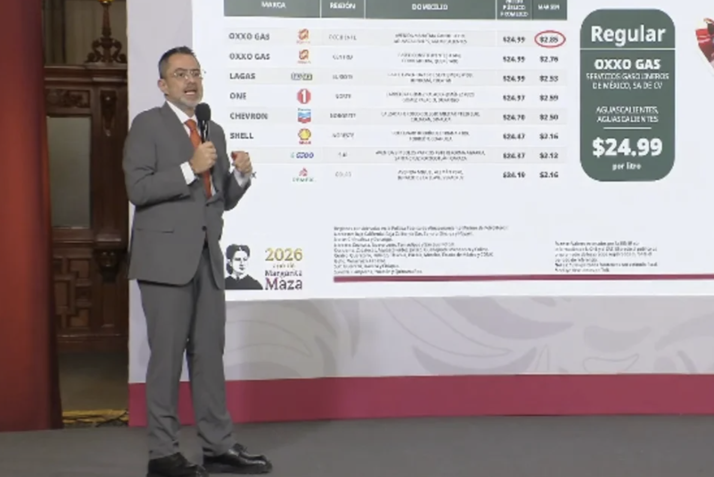 Aunque PEMEX percibe alrededor de 3 mil millones de pesos adicionales por exportaciones de crudo, lo que reduce el impacto neto del subsidio a aproximadamente 2 mil millones de pesos semanales, el precio promedio nacional de la gasolina regular al 3 de abril de 2026 fue de 23.70 pesos por litro. Sheinbaum advirtió sobre posibles abusos: “No puede ser que haya gasolineros que, de manera tramposa, estén subiendo el precio a pesar de que se está dando el apoyo para que no suba tanto el precio ni de la gasolina magna ni del diésel”. Se identificó una estación de OxxoGas en Aguascalientes que vendía el litro a 24.99 pesos con un margen de ganancia de 2.85 pesos por litro, por encima del límite acordado de dos pesos.