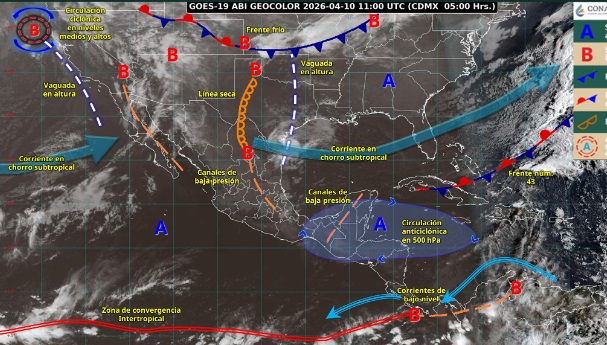 De acuerdo con la Comisión Nacional del Agua, para el 10 de abril se pronostican lluvias puntuales fuertes con la posible formación de torbellinos en la zona fronteriza de Chihuahua, Coahuila, Nuevo León y Tamaulipas. Prevalecerá la onda de calor en zonas del sur y centro del país.
