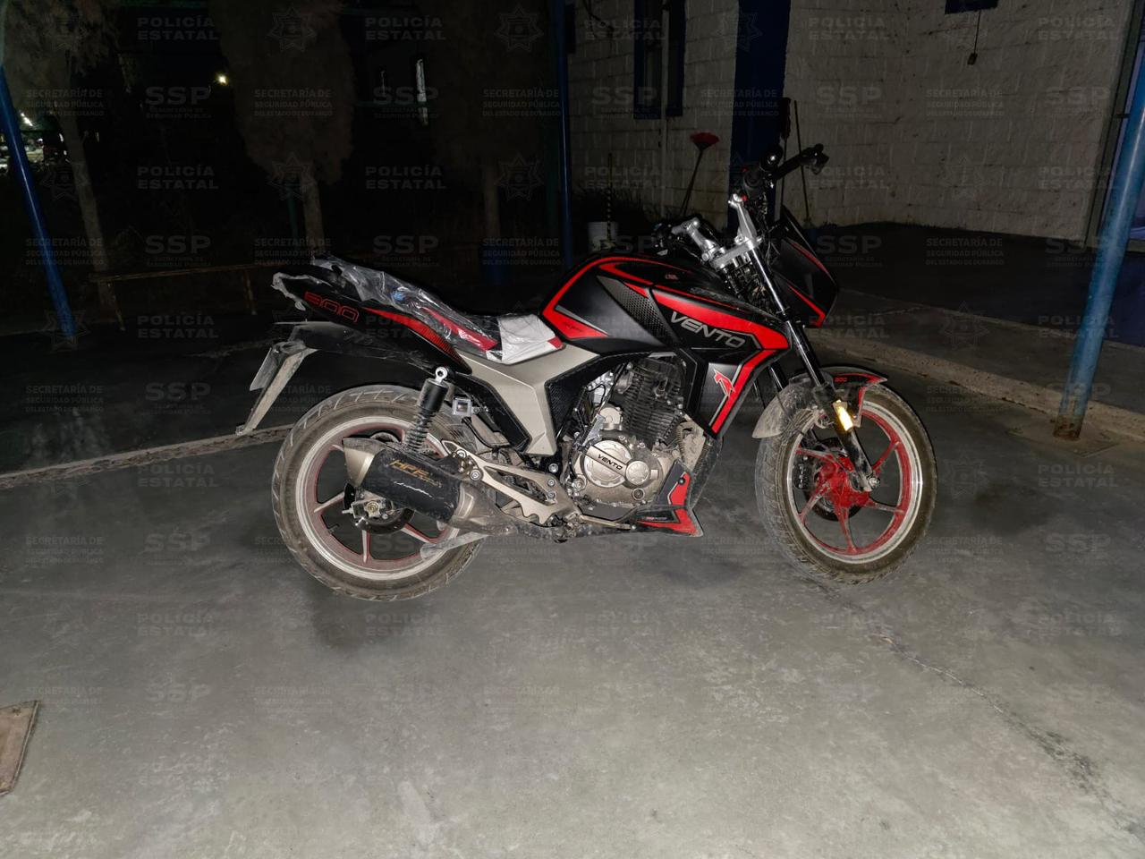 La motocicleta era marca Vento Tornado, modelo 2026, en color rojo con negro, con placas del estado de Durango que pertenecían a otra unidad, específicamente a una moto marca Italika modelo 2023.